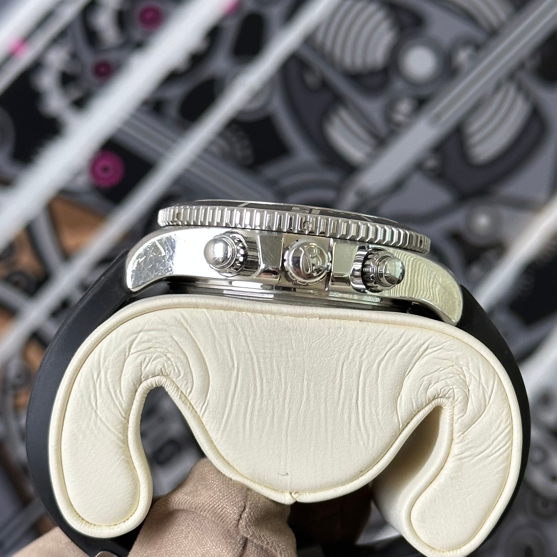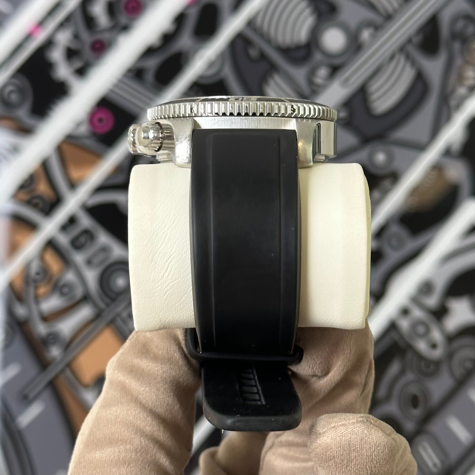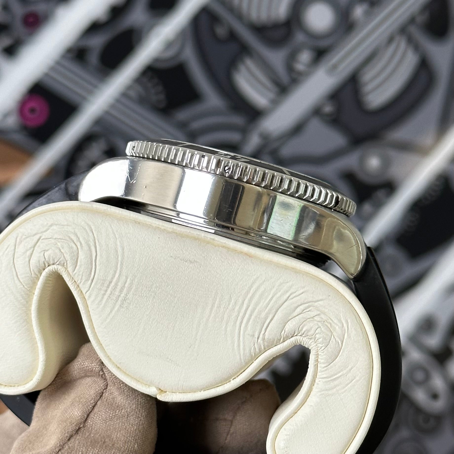 The watch is in preowned condition with moderate amount of scratches on the case sides. There are some flaws on the bezel as shown in photo. The strap has flaws as well but still has plenty of life left.
