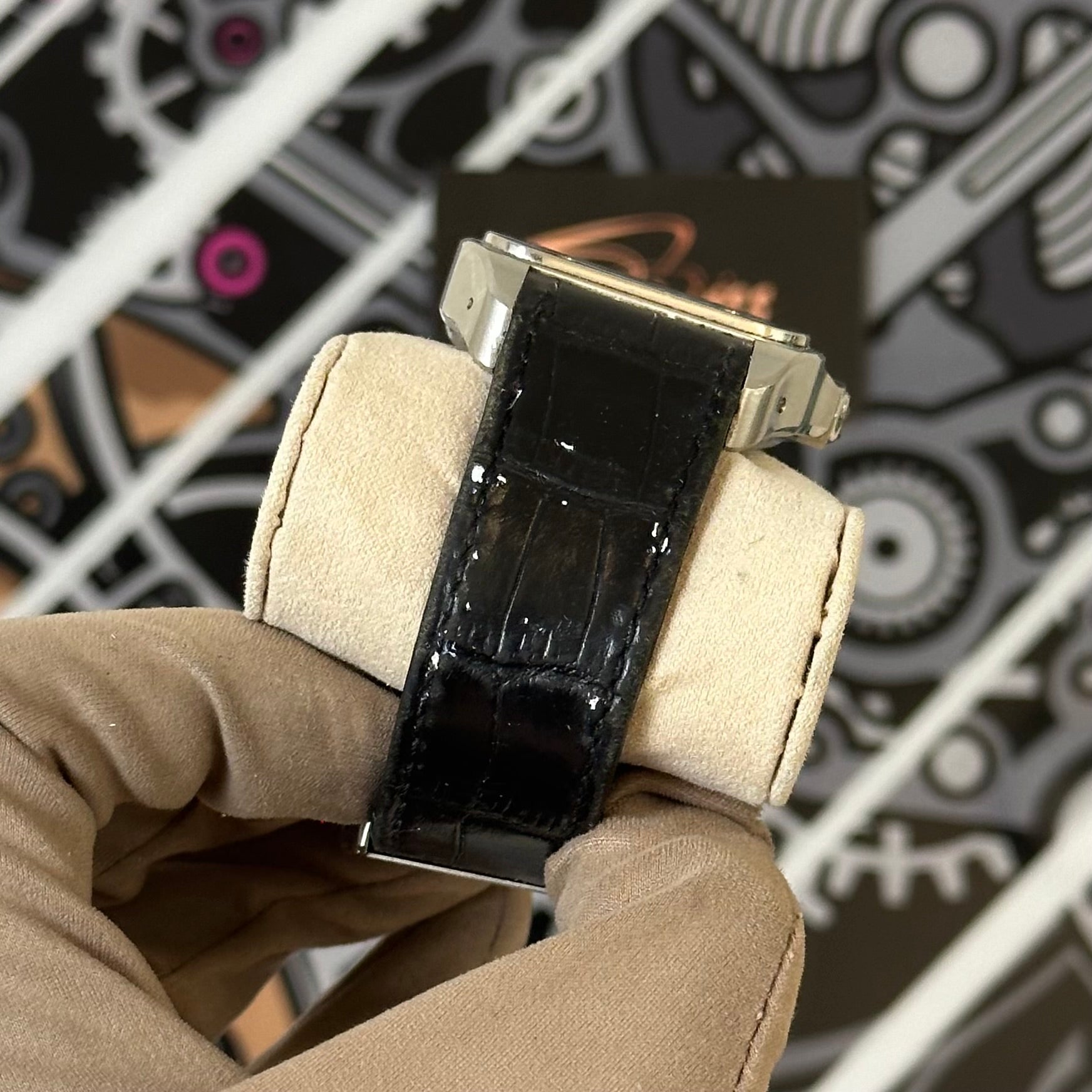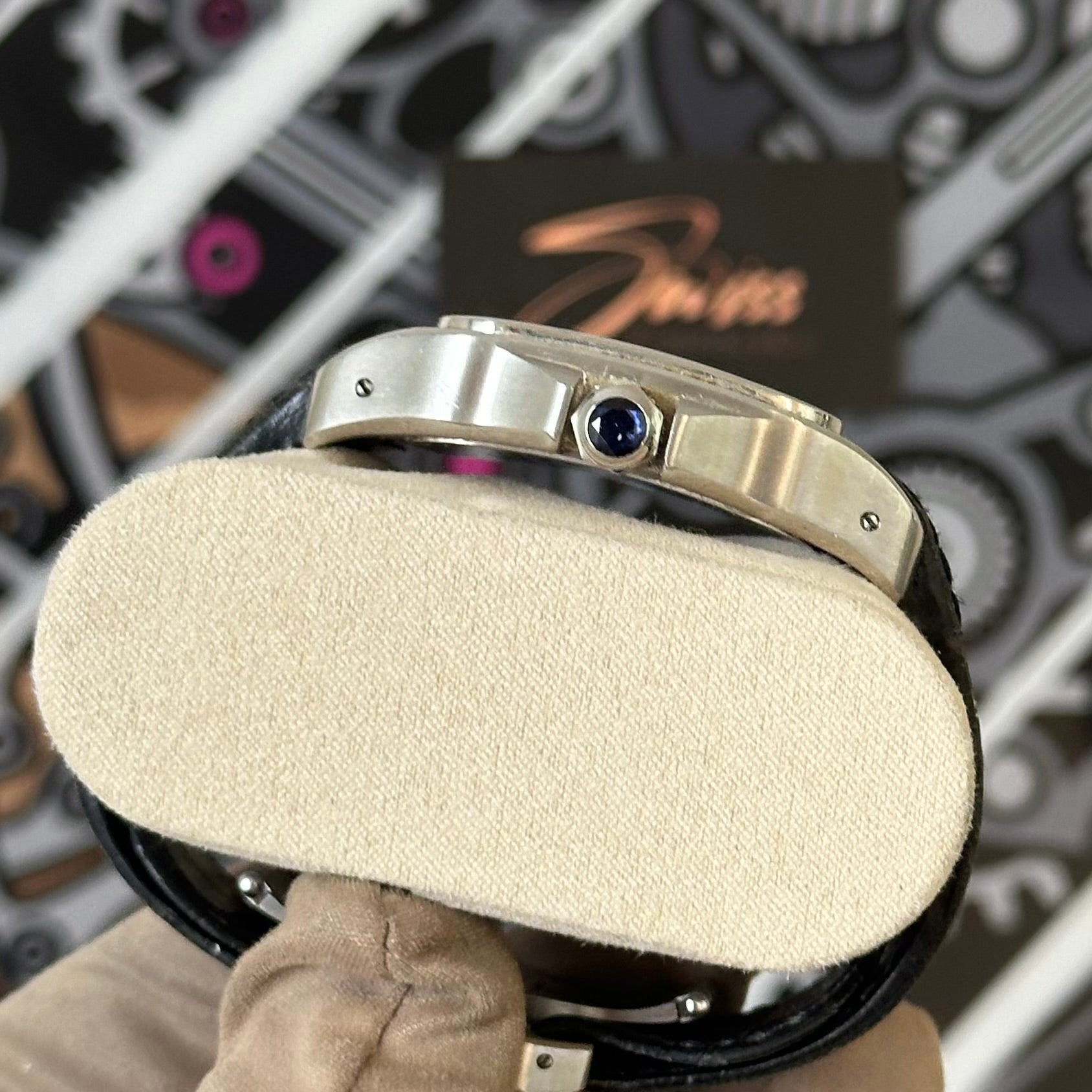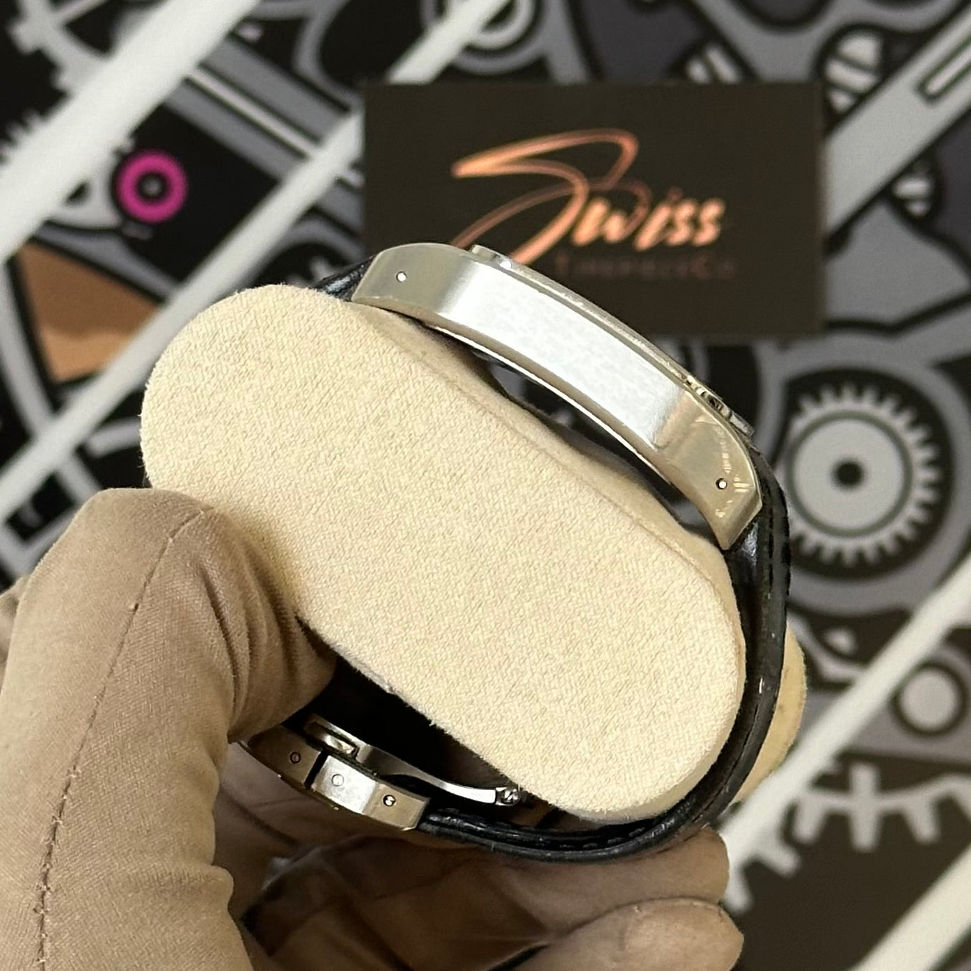 The watch has heavy signs of wear on the case and bezel. Could use a polish to bring it back to excellent condition. The crystal and dial are both clean. The leather strap is in decent shape, also shows signs of wear.