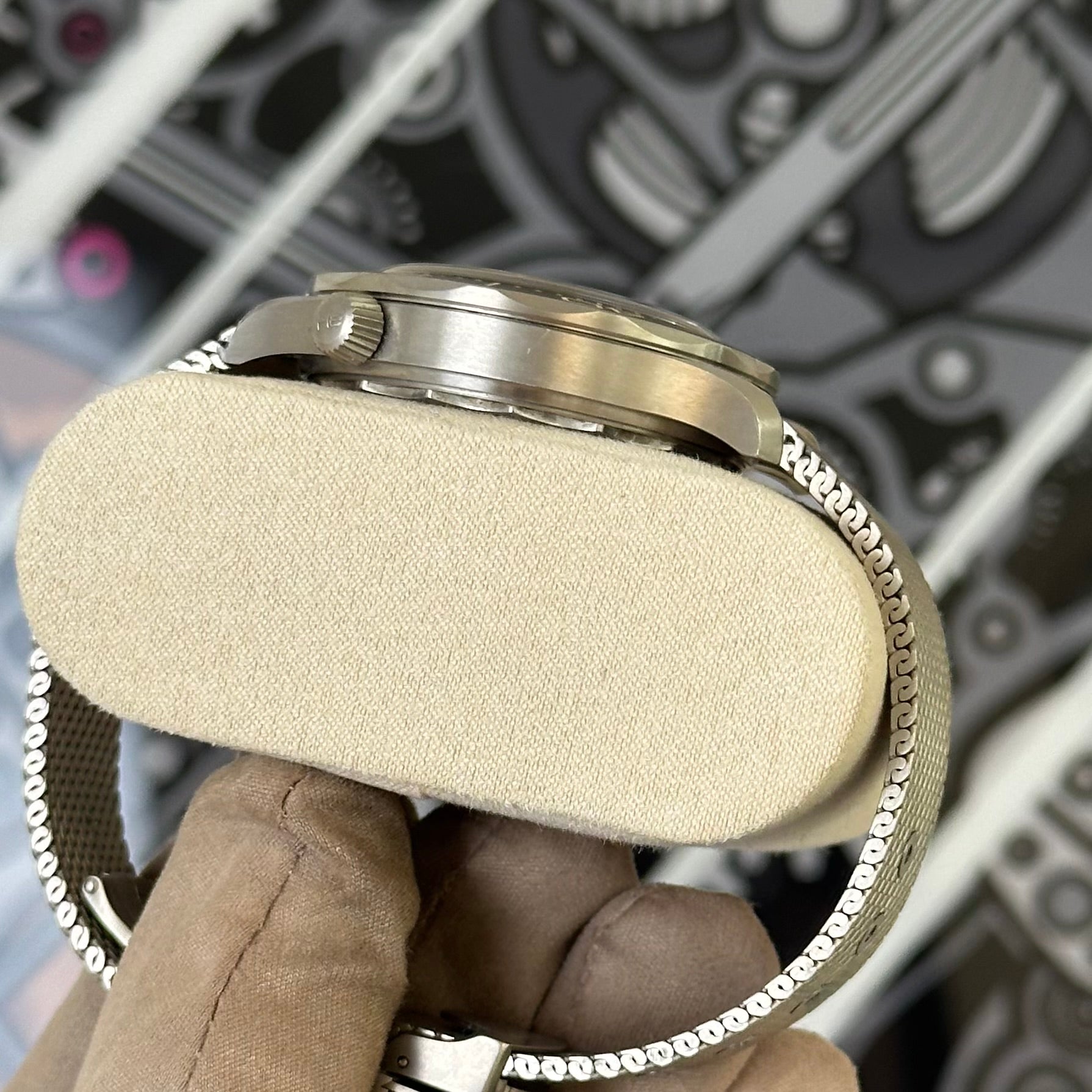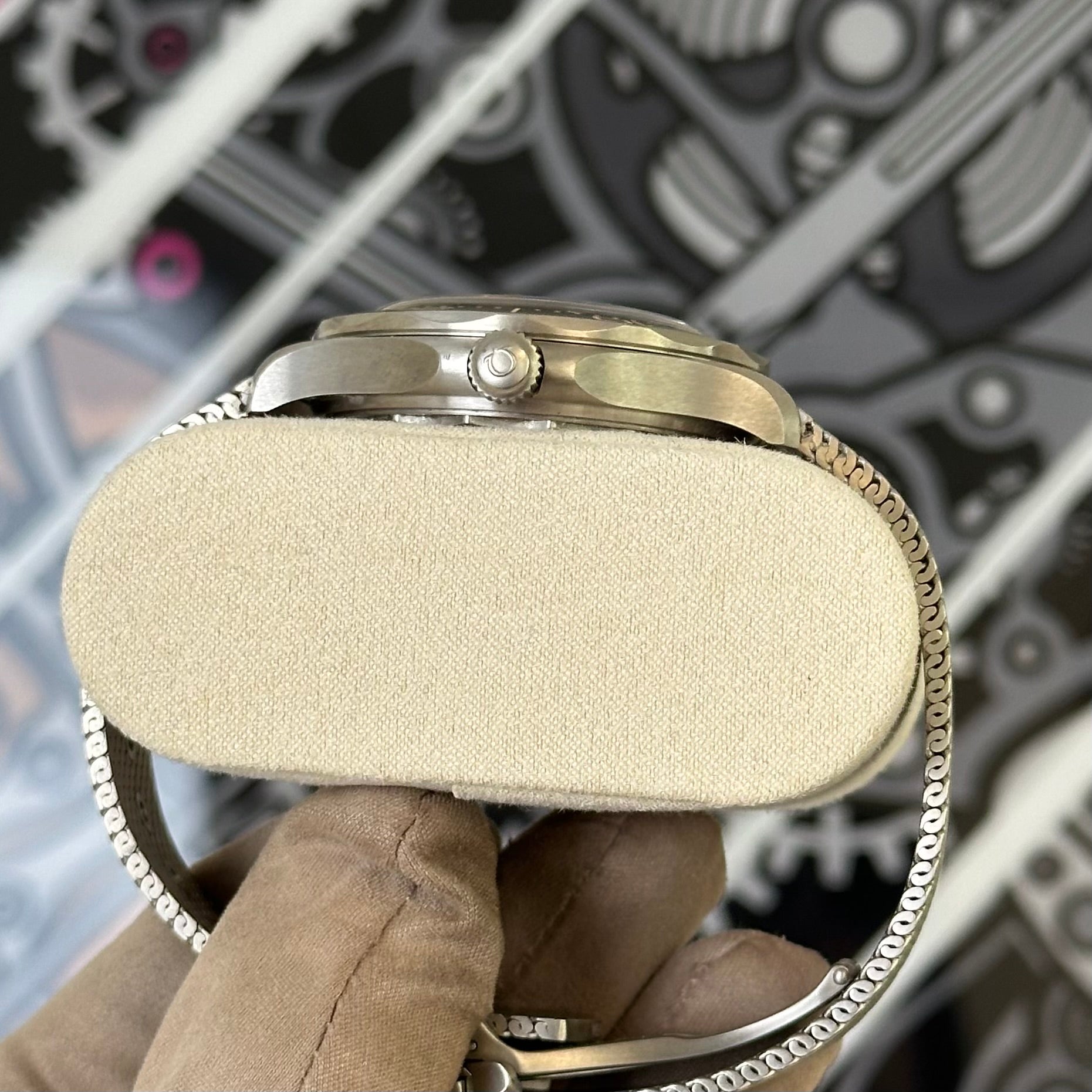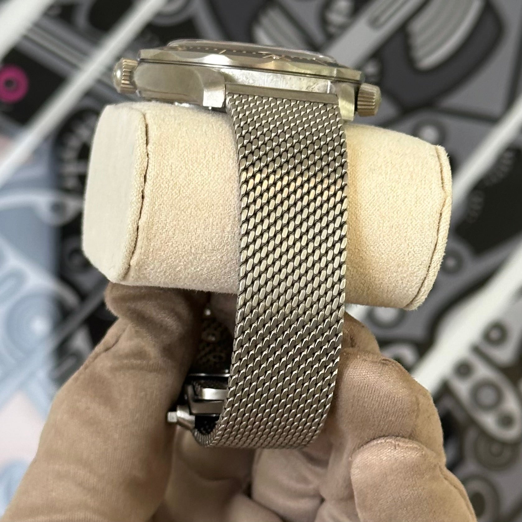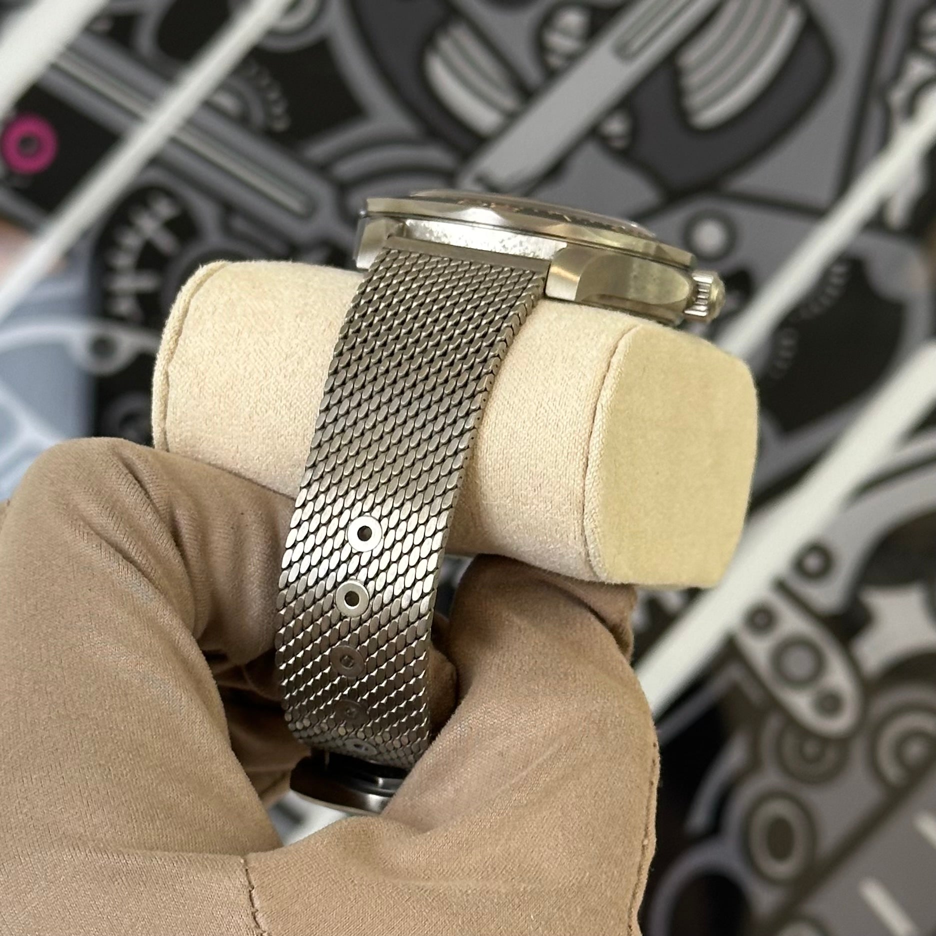 The watch case is in pre-owned condition with a couple small marks on the sides of the case and couple small nicks at the 6 o clock side bezel. The crystal and dial are both clean. The bracelet is in good shape and the clasp has some scratches.