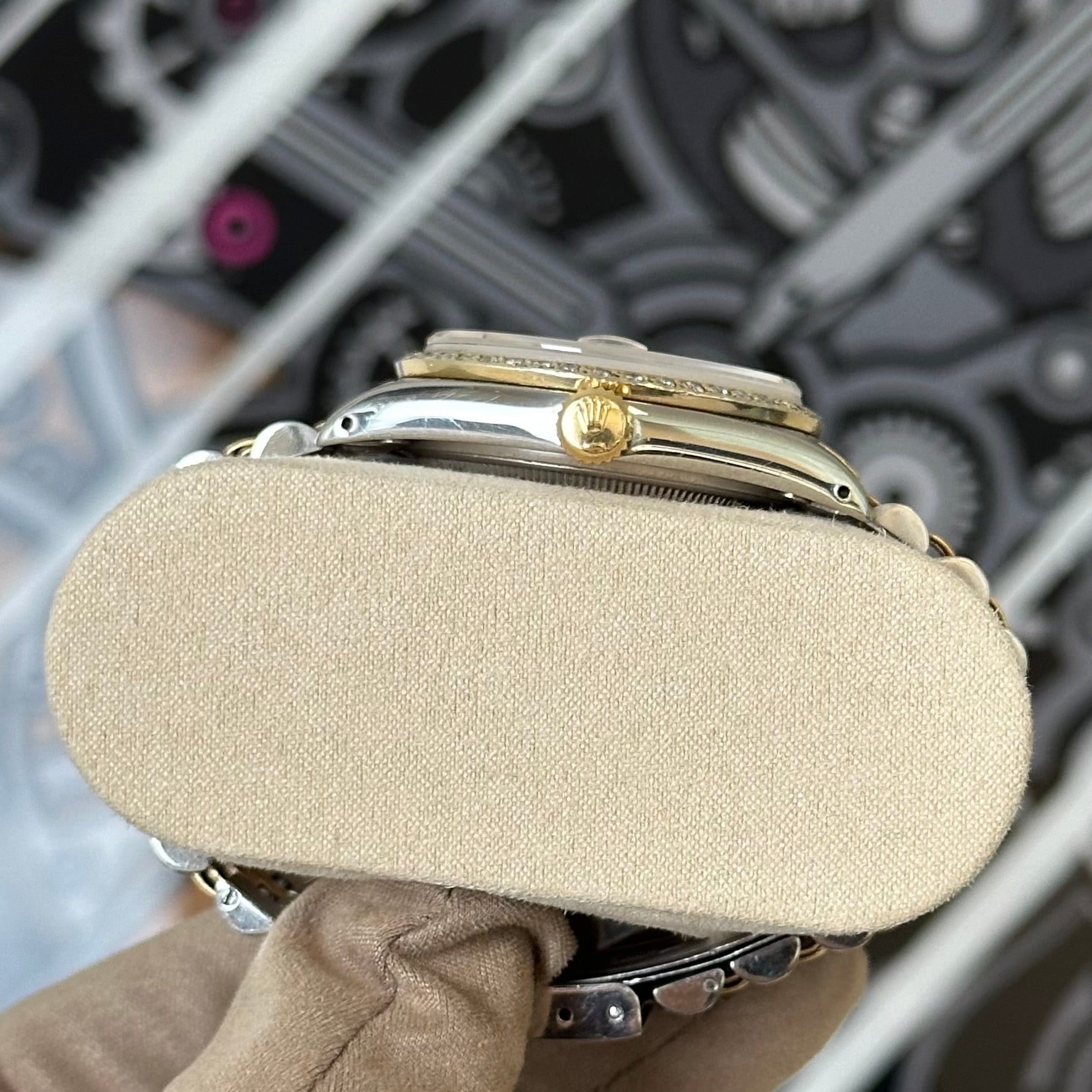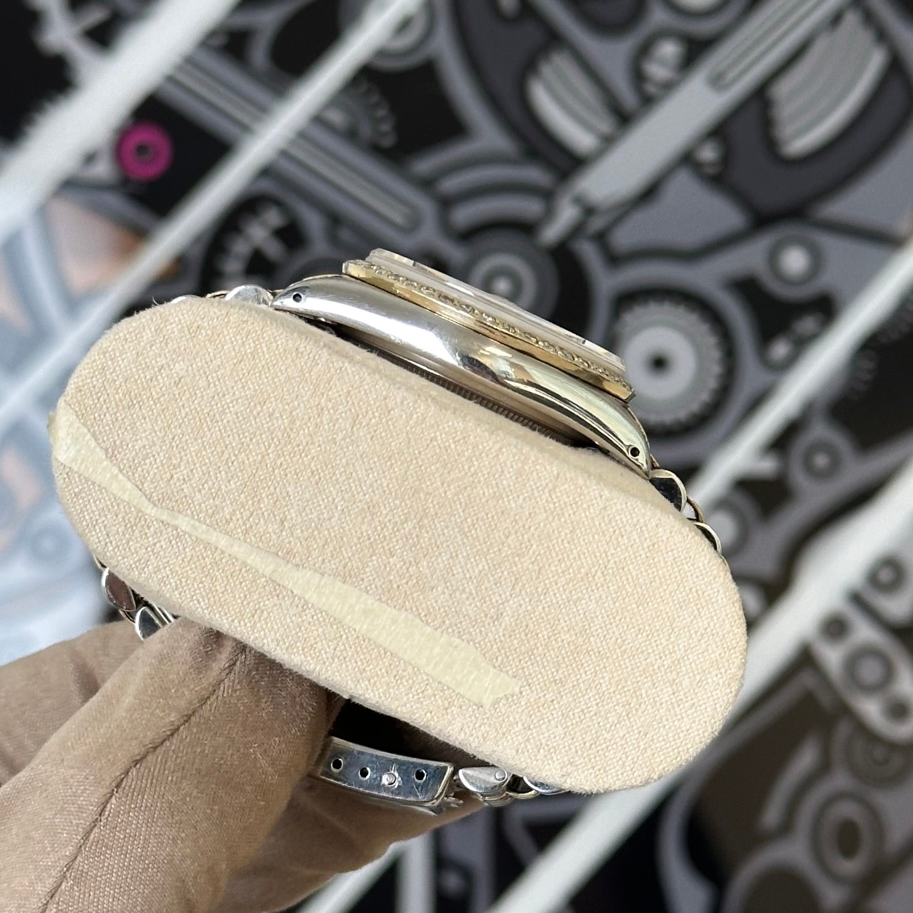 The watch is in pre-owned condition with signs of wear overall. There are marks on the crystal and on the cyclops. The dial does have white spotting on it.