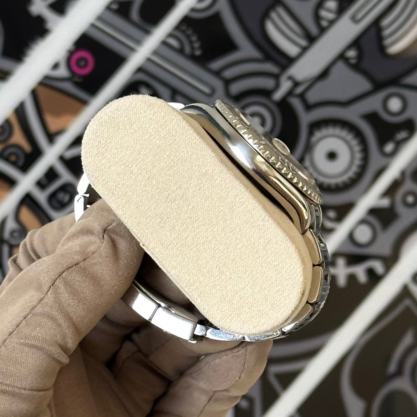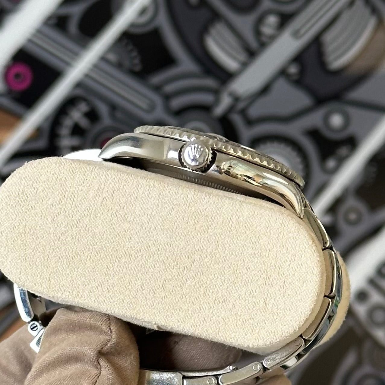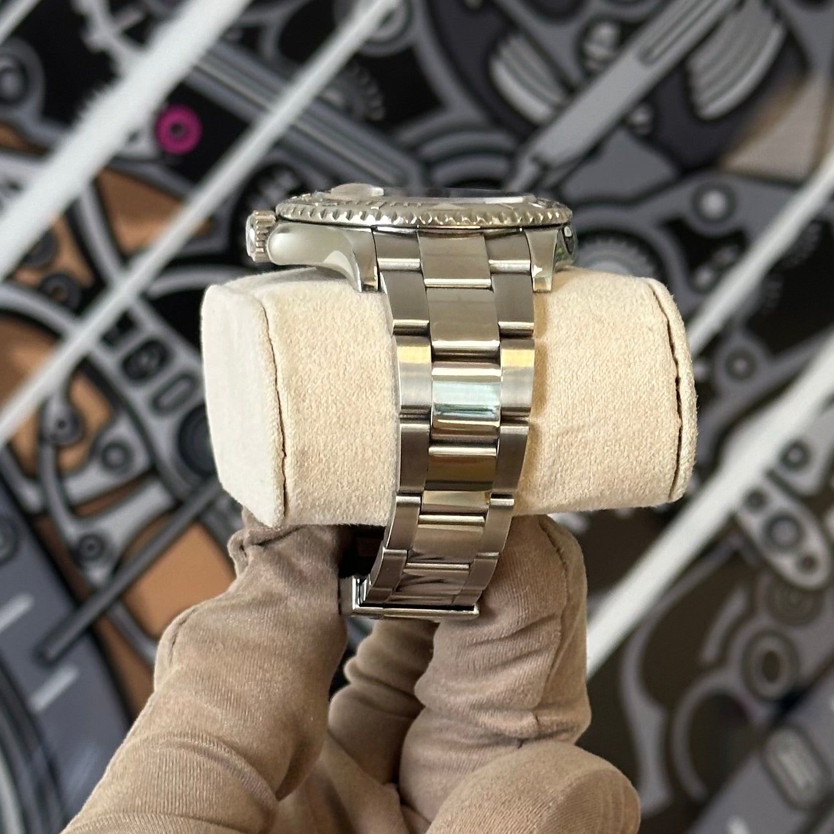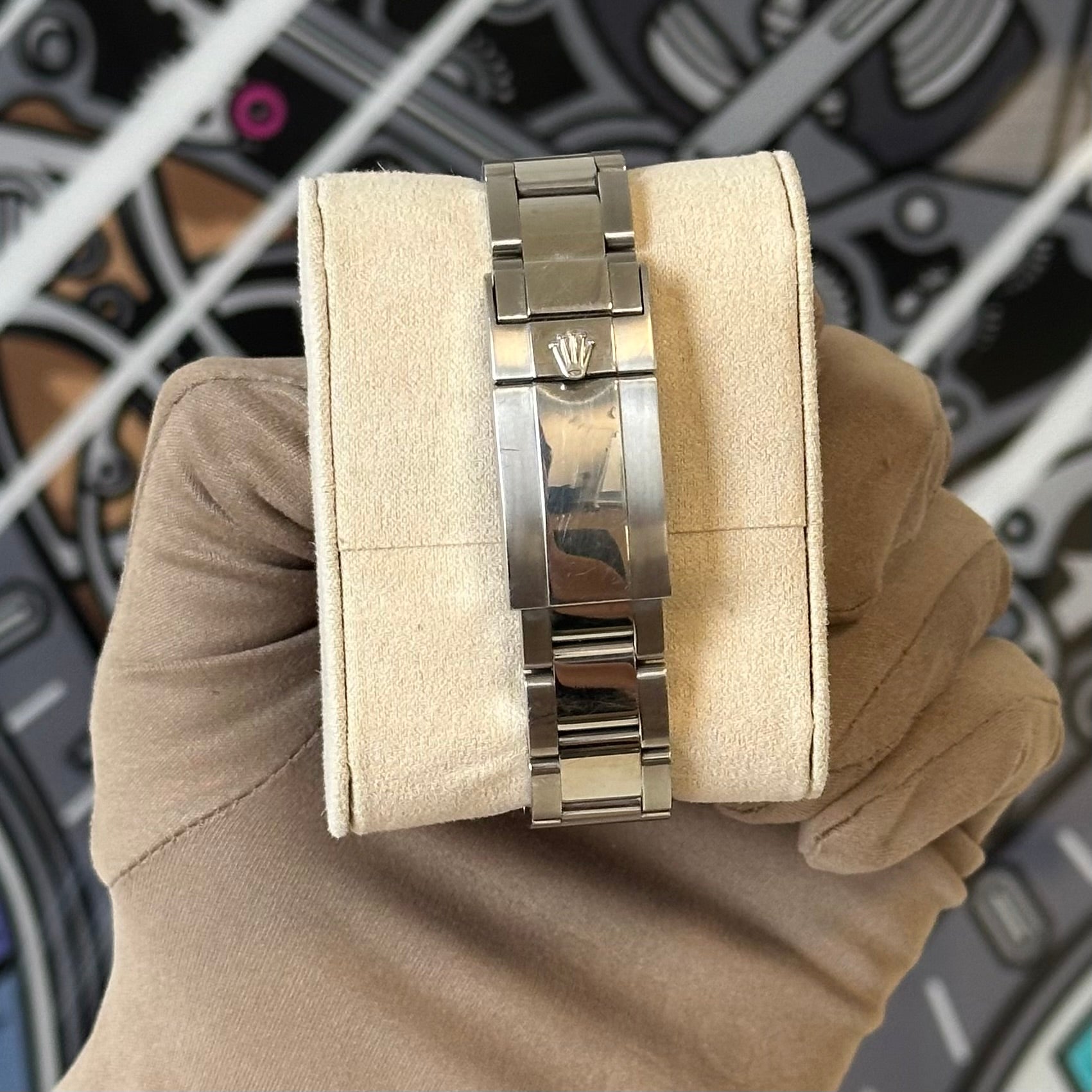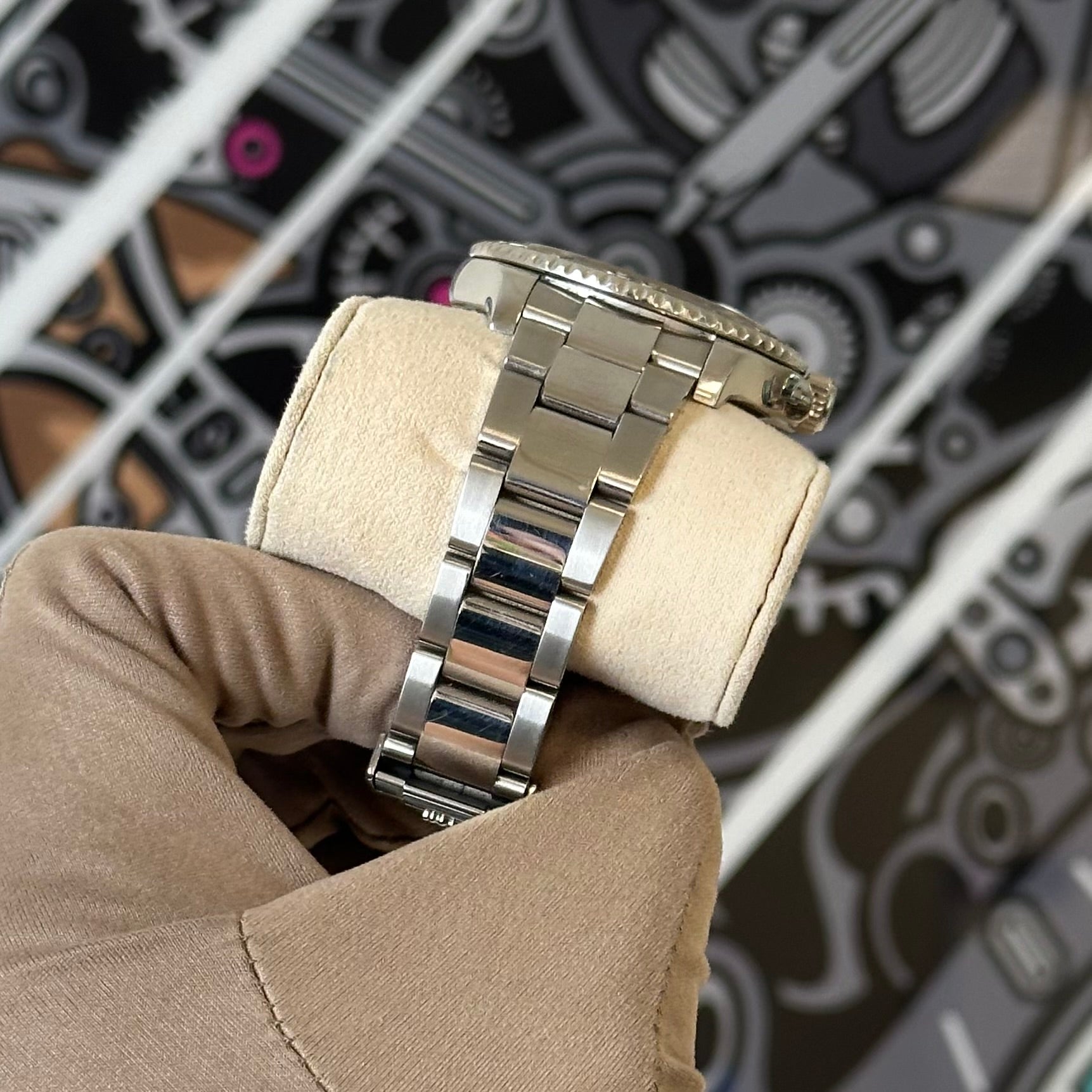 The watch is in pre-owned shape with moderate to heavy scratches on the case sides and on the bracelet. The crystal and dial are both clean.