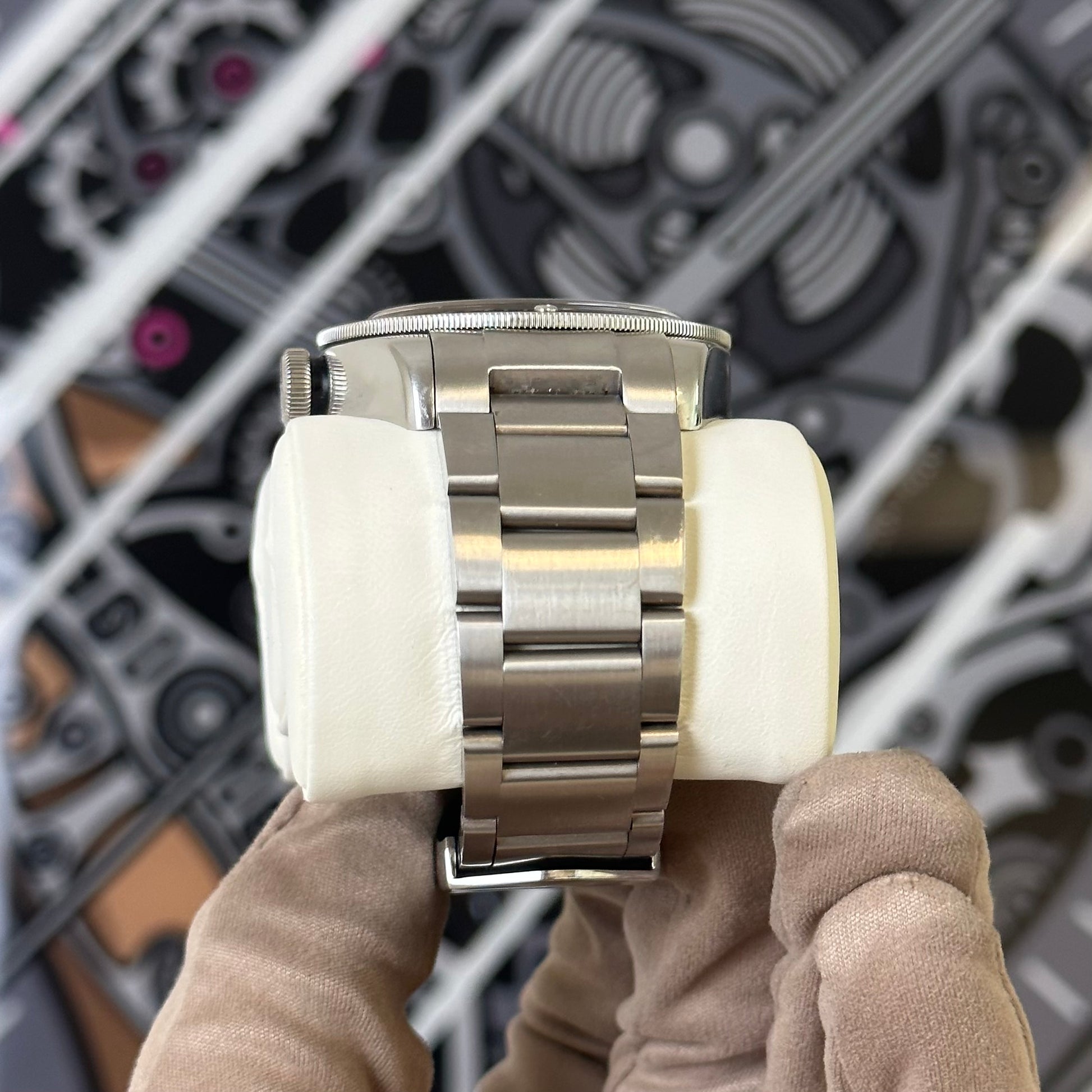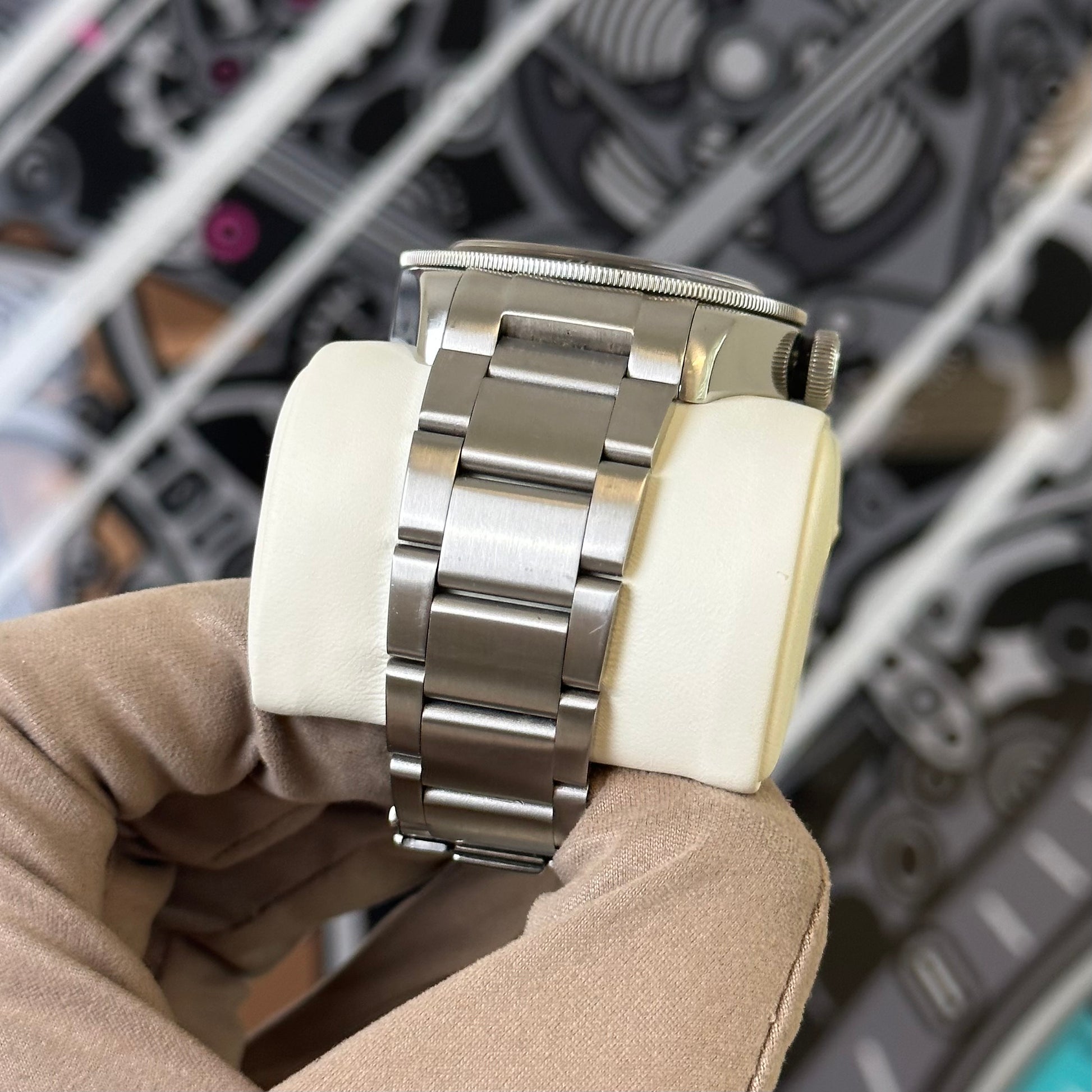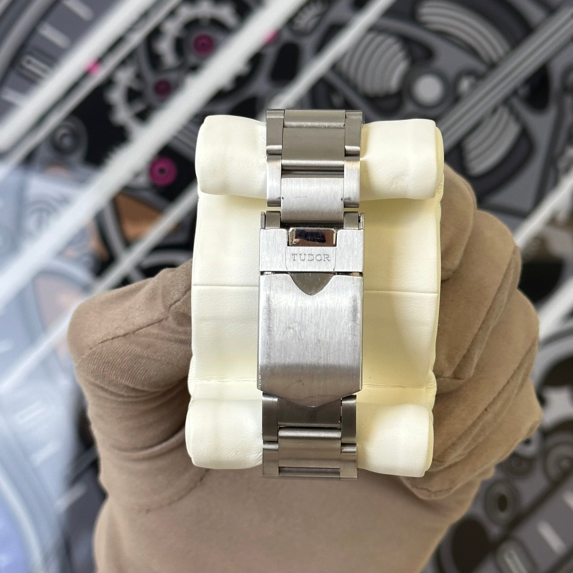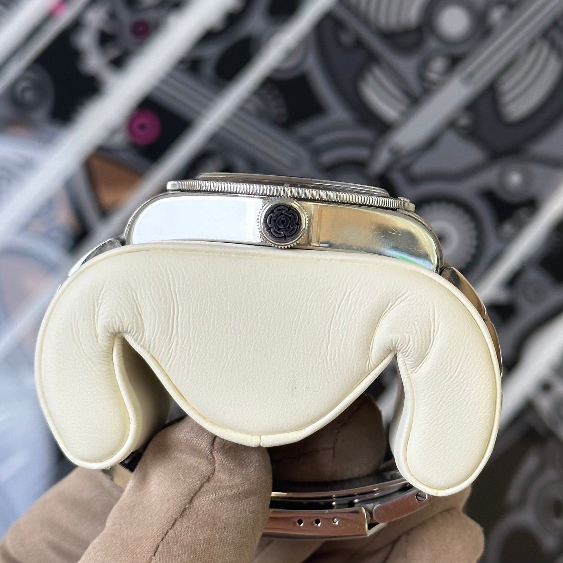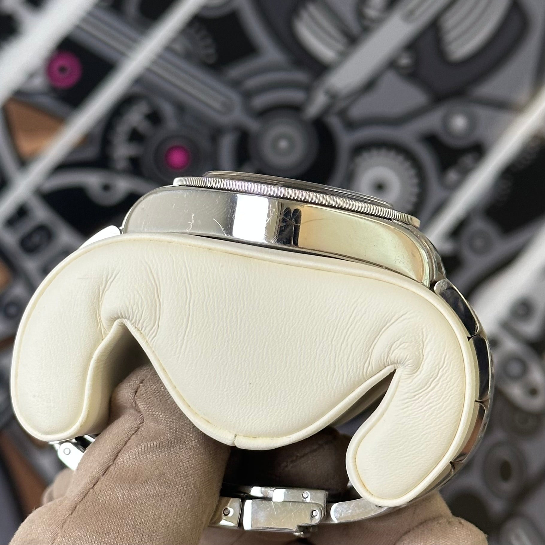 The watch is in preowned condition with moderate amount of scratches on the case metal. Moderate amount of surface scratches on the bracelet/clasp and overall could use a polish to bring it back to good shape.