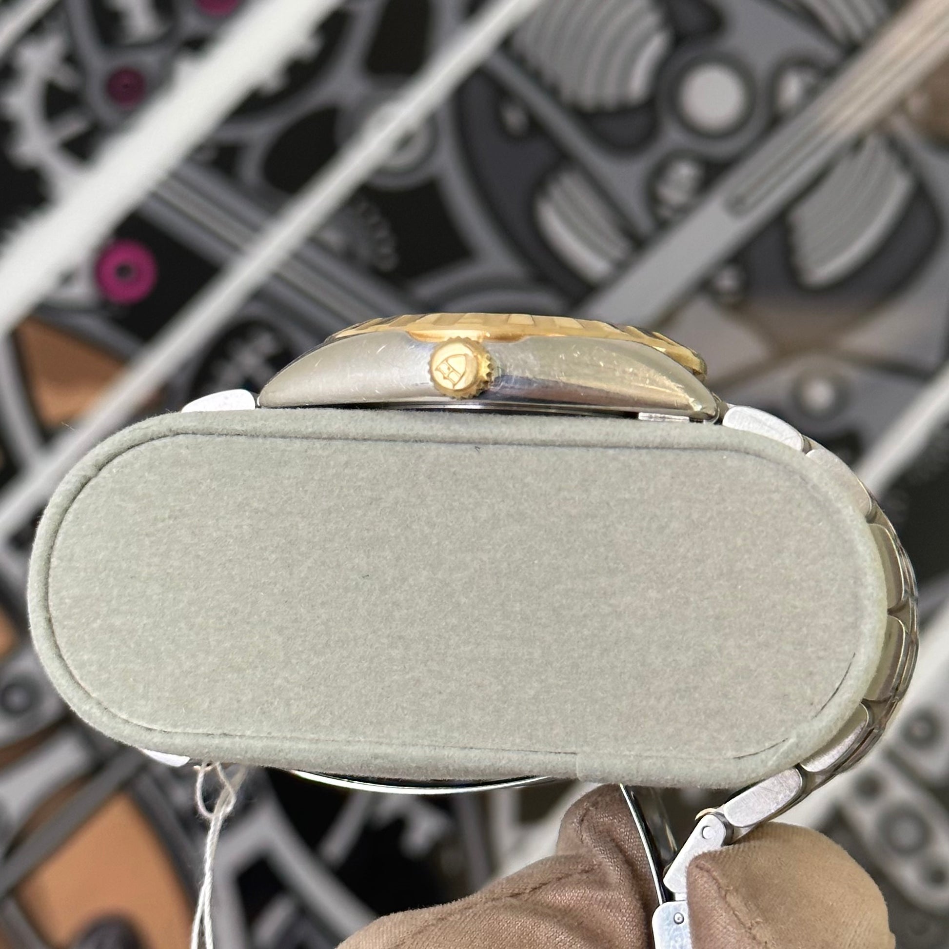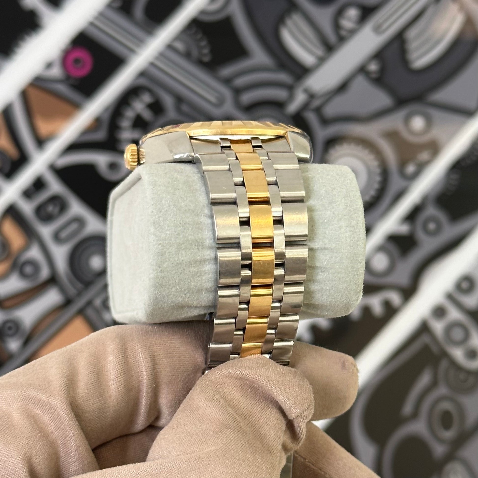 Heavy amount of wear on the case and throughout the watch. The crystal and dial are both clean. The watch functions and keeps time well. Bracelet fits slightly under 7 inches.